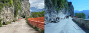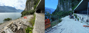 In entrambi i casi l’immagine a sinistra con i colori migliori è quella di un anno fa. A prima vista sembra che in 365 giorni non sia cambiato quasi nulla, ma zoomando un po’ sul cantiere principale si notano due cose interessanti: in primo luogo ci sono ben quattro tecnici al lavoro, e soprattutto stanno prendendo forma le strutture di un prolungamento in artificiale della galleria esistente, con l’evidente scopo di difesa da frane e cadute di sassi,