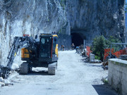 si comincia a vedere le prime timide tracce dei lavori per la prosecuzione in territorio trentino: un cantiere minuscolo che termina alla galleria Limniadi che si vede sullo sfondo: sì e no 100 metri di mensola e costi in proporzione.
