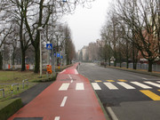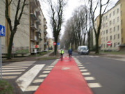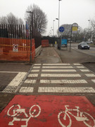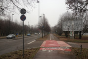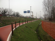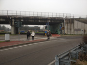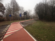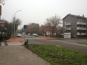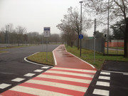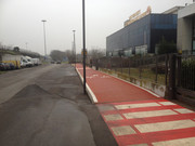 la ciclabile ora piega a destra in modo da porre l'attraversamento della strada che porta all'ipermercato sufficientemente lontano dalla rotatoria; poi si ritorna in senso opposto per attraversare la rotatoria sotto il viadotto, protetta da un semaforo a chiamata.