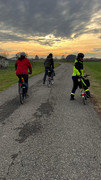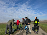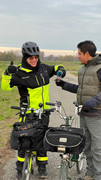 (foto Manfro)La variante, da Soarza verso San Giuliano Piacentino e poi ritorno alla ciclabile sull’argine, comprende anche un paio di chilometri della SP588R, per fortuna non troppo trafficata, che affrontiamo in rigorosa fila indiana e con tutte le luci accese, poi un altro po’ di strada non asfaltata ma nemmeno troppo fangosa, che percorriamo poco prima che faccia buio. Ritornati sul percorso normale, un’occhiata all’orologio ci suggerisce di attivare la modalità “velocità smodata” per raggiungere la stazione di Cremona prima del treno. Pian piano il gruppo si sfilaccia un po’ e alla fine Leo e Emy, i più provati dopo un anno che non toccavano bici (ma anch’io sono parecchio in riserva) ci salutano poco prima del ponte sul Po, mentre noi ci produciamo nell’ultima volata: all’arrivo in stazione l’orologio segna le 17.22, il treno è alle 17.30: ce l’abbiamo fatta!